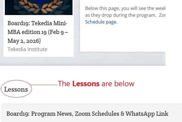 The first lesson is Board17: Program News, Zoom Schedule & WhatsApp Link. Click it for program news and Zoom schedules (that is a restricted area; if you cannot access it, contact Admin). Week 1, Week 2, etc will be dropping under the Lessons area in coming weeks. Note: once you have done this setup, next time, just go to https://school.tekedia.com/ and login).